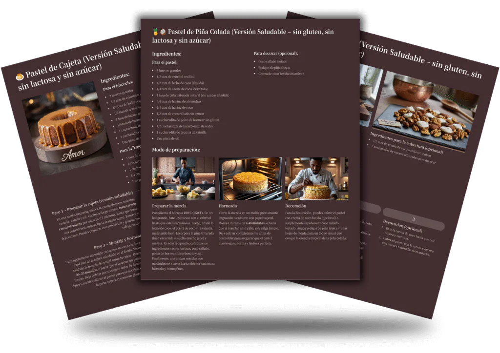 Descubre 500 recetas de pasteles suaves, esponjosos y sabrosos, completamente libres de gluten, lácteos y azúcar, para que puedas disfrutar de cada bocado sin dolor, culpa ni restricciones.